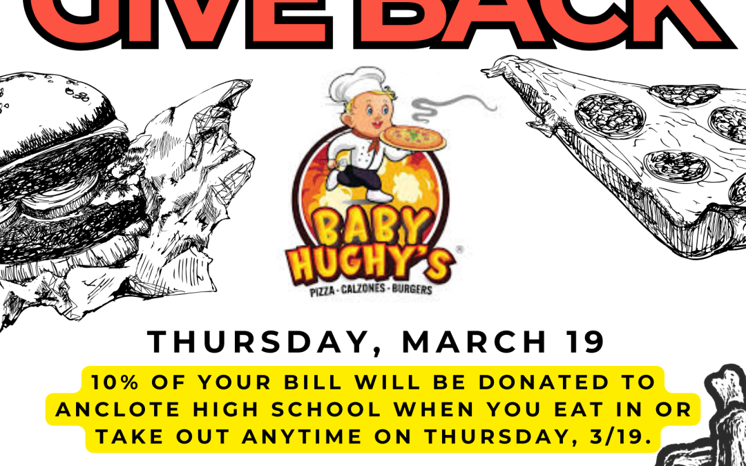 Baby Hughy’s has been a great support of Anclote High School Athletics, Parent Involvement and Teacher Support! Help us support Baby Hughy’s on Thursday, 3/19, and when you do, they will donate 10% back to Anclote High School of all proceeds made.